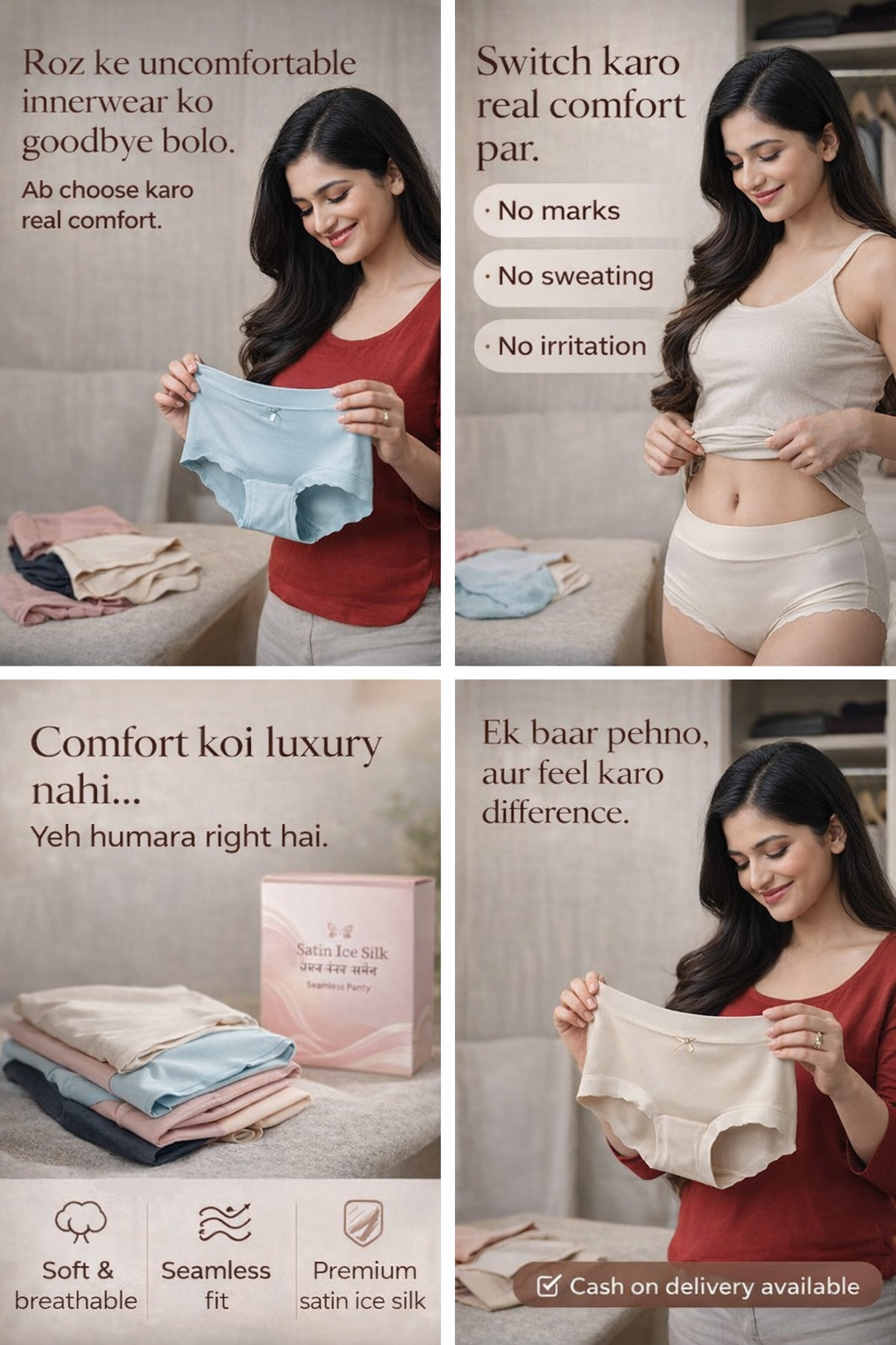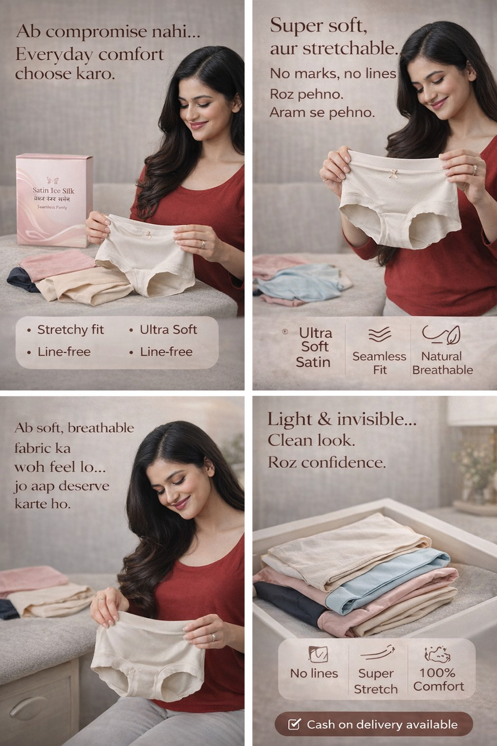 Experience the soft, smooth and premium feel of Satin Ice Silk Seamless Panties — designed for all-day comfort and a clean, invisible look under any outfit.